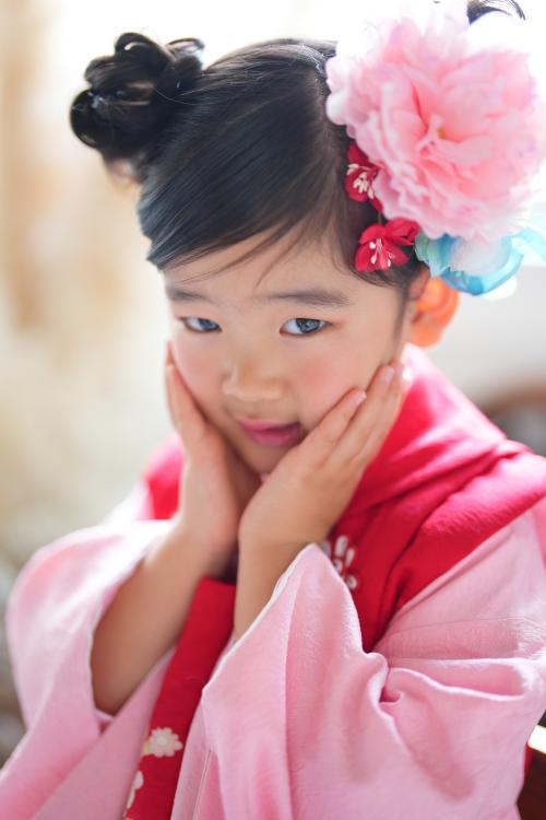 ピンクの着物に赤い被布、大きな花の髪飾りがとても華やかでした。