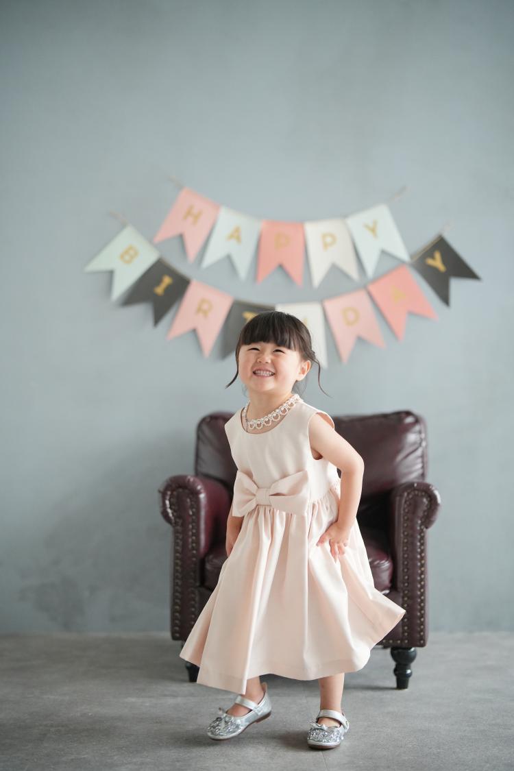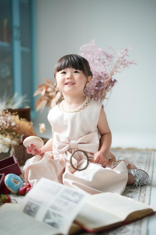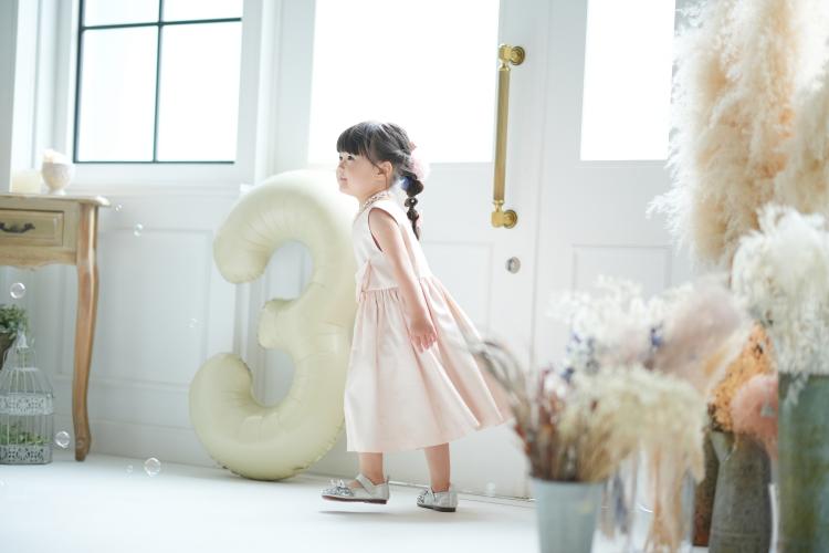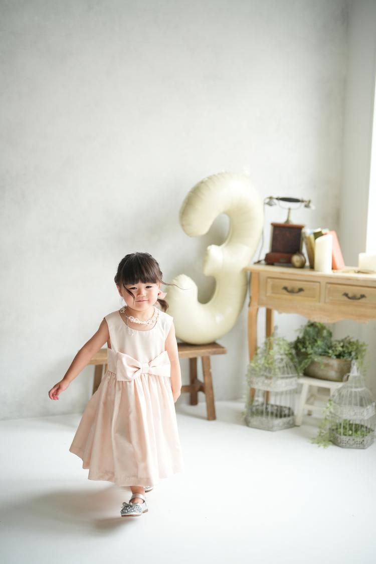 和装から洋装へと衣装チェンジし、ふんわりと広がるピンク色のドレス姿に変身です。可愛らしい色合いと柔らかな素材感が、3歳の女の子の雰囲気にぴったり。自然光がたっぷり入る新宿・四谷のStudioCaptureFreeならではのやさしい光が、ドレスの淡い色味を一層引き立てます。