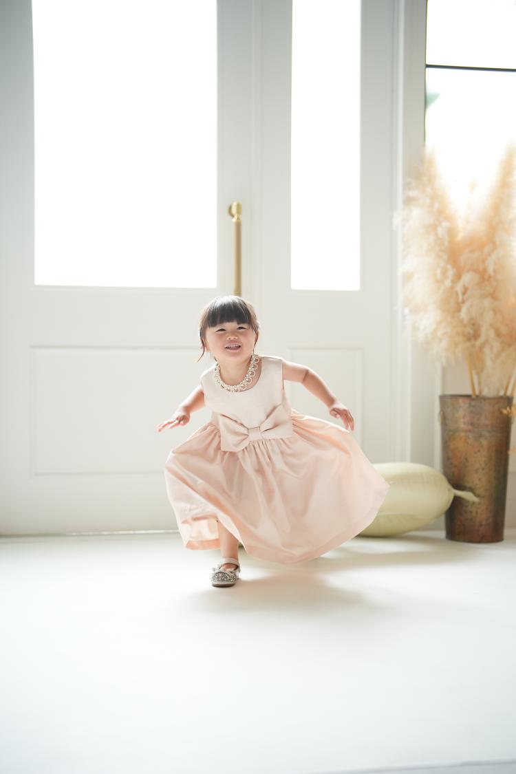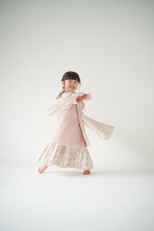 続いては、小物を手放して自由に動いてもらいながらの撮影。白ホリゾントは余計な装飾がない分、女の子の表情や仕草が一層際立ちます。小さなステップを踏んだり、くるっと回ってみたりと、3歳ならではののびのびとした姿が次々と広がりました。