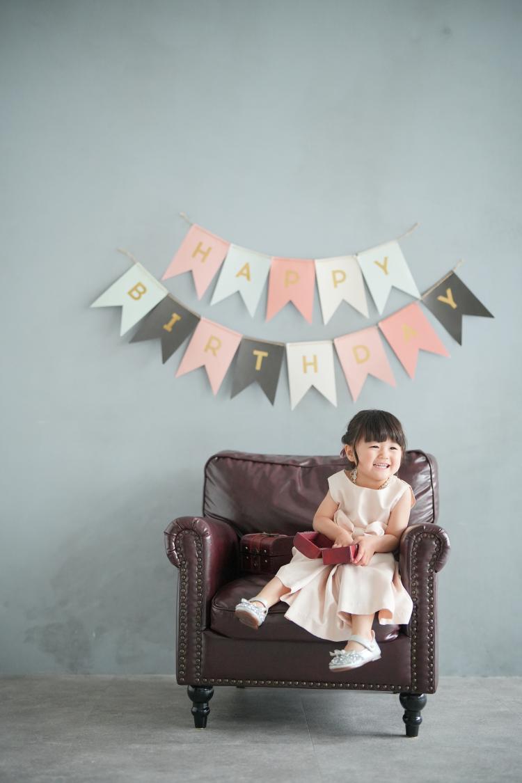 また、グレーのシンプルな背景には「Happy Birthday」のガーランドを飾り付け、特別な空間を演出しました。落ち着いた背景と可愛らしいガーランドの組み合わせが、女の子の笑顔を引き立てています。