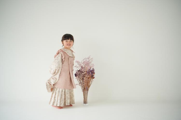 お選びいただいたのは、スタジオオリジナルの和装。淡く優しい色合いと、動きやすさを兼ね備えた、3歳さんにもぴったりの衣装です。