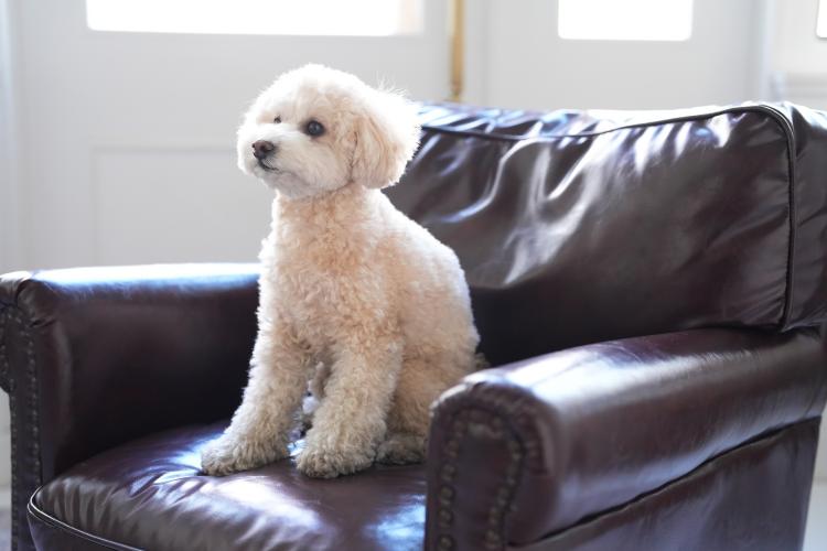 窓前のやわらかな自然光の中、クリーム色の美しい毛並みが映える椅子をご用意しました。