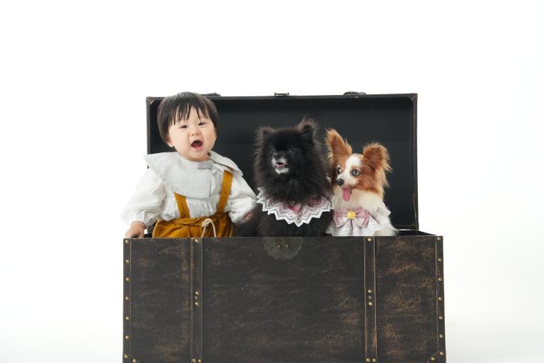 おしゃれな宝箱の中に入り、愛犬とスリーショット!