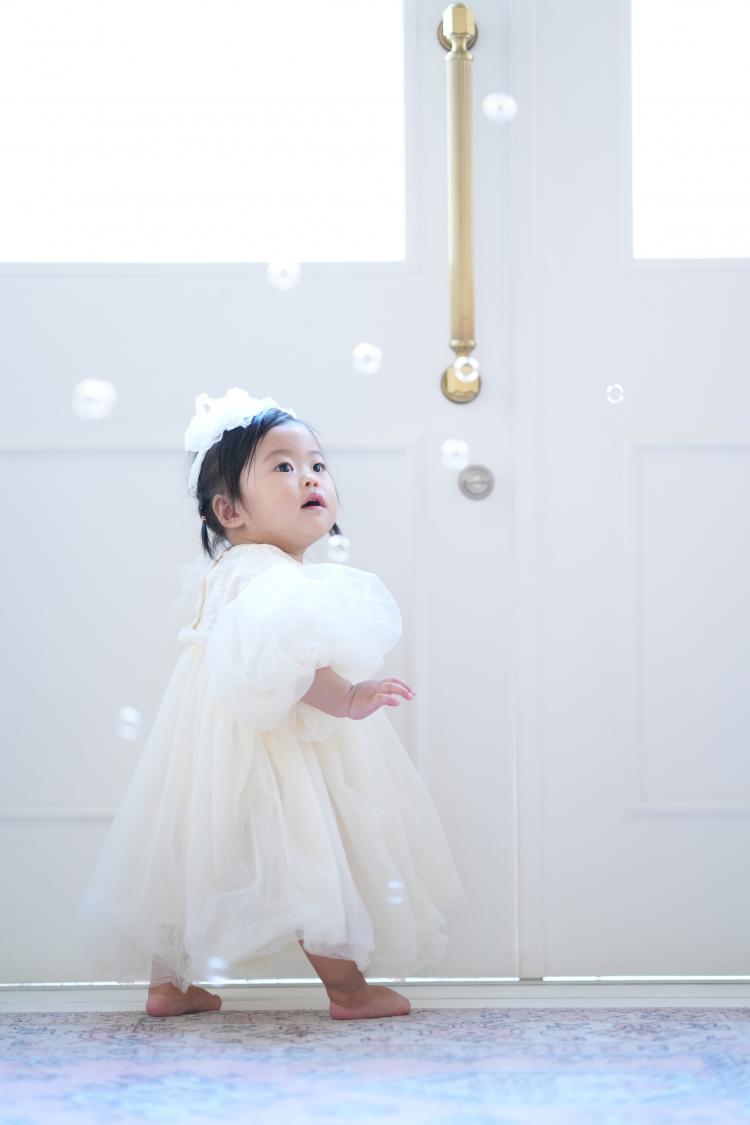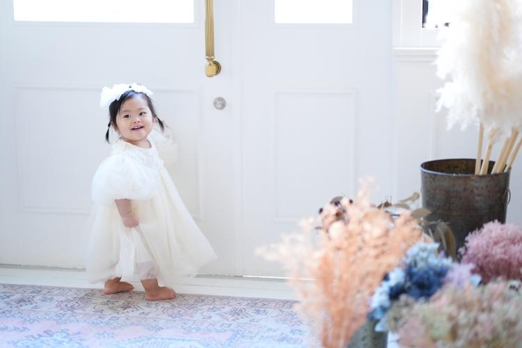 今回ご紹介する撮影は、ベビーフォト バースデー 1歳女の子の撮影です。スタジオの衣装を着たりお持ち込みの衣装を着たりと合計3着撮影することが出来ました。