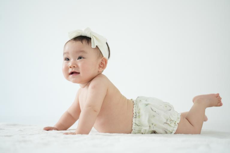 今度は可愛くヘアバンドにオムツカバーを着用しての撮影になります!