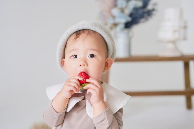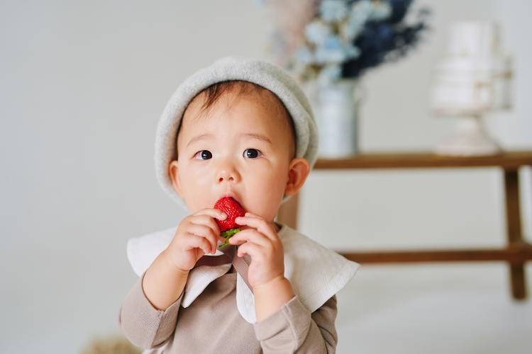 いちごを手にすると思わず、あーんとお口を大きく開けてかぶりつこうとする様子が愛おしい!