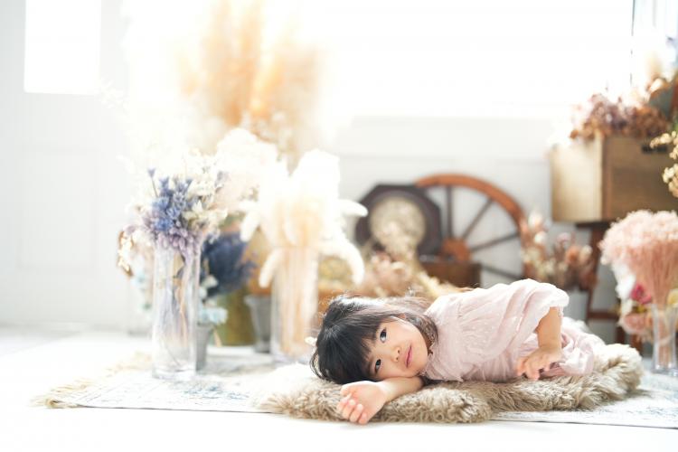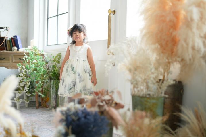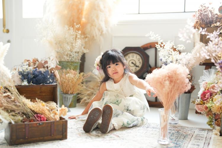 衣装に合わせて背景はドライフラワーを使用し、世界観をやさしくまとめました。