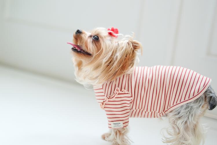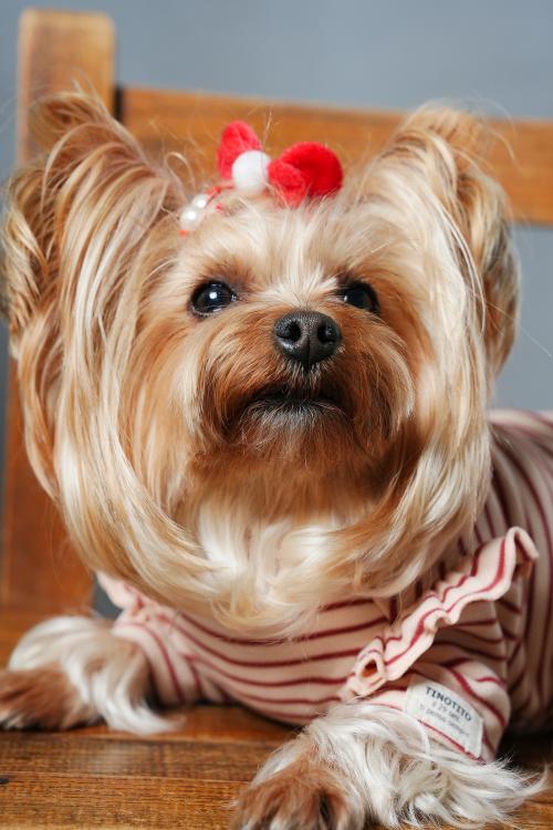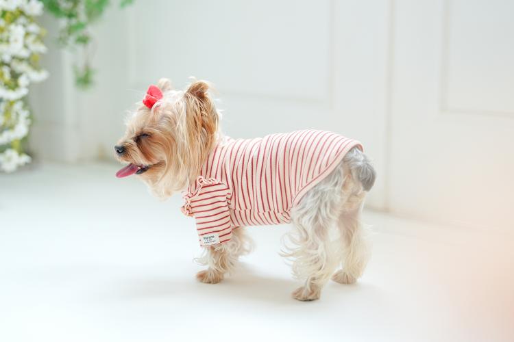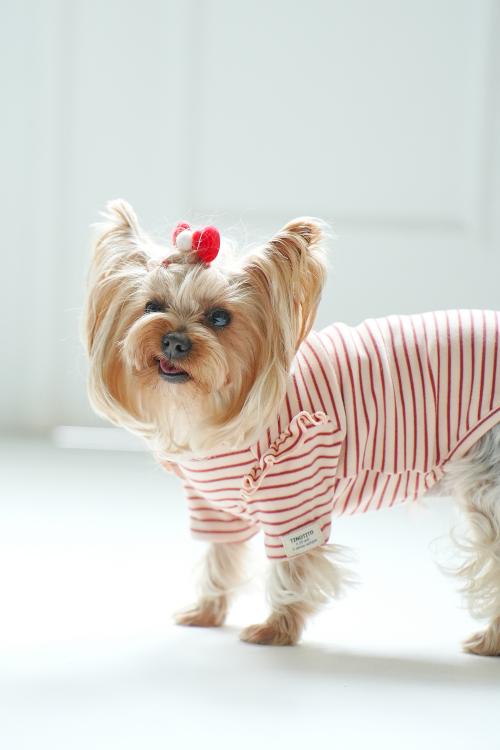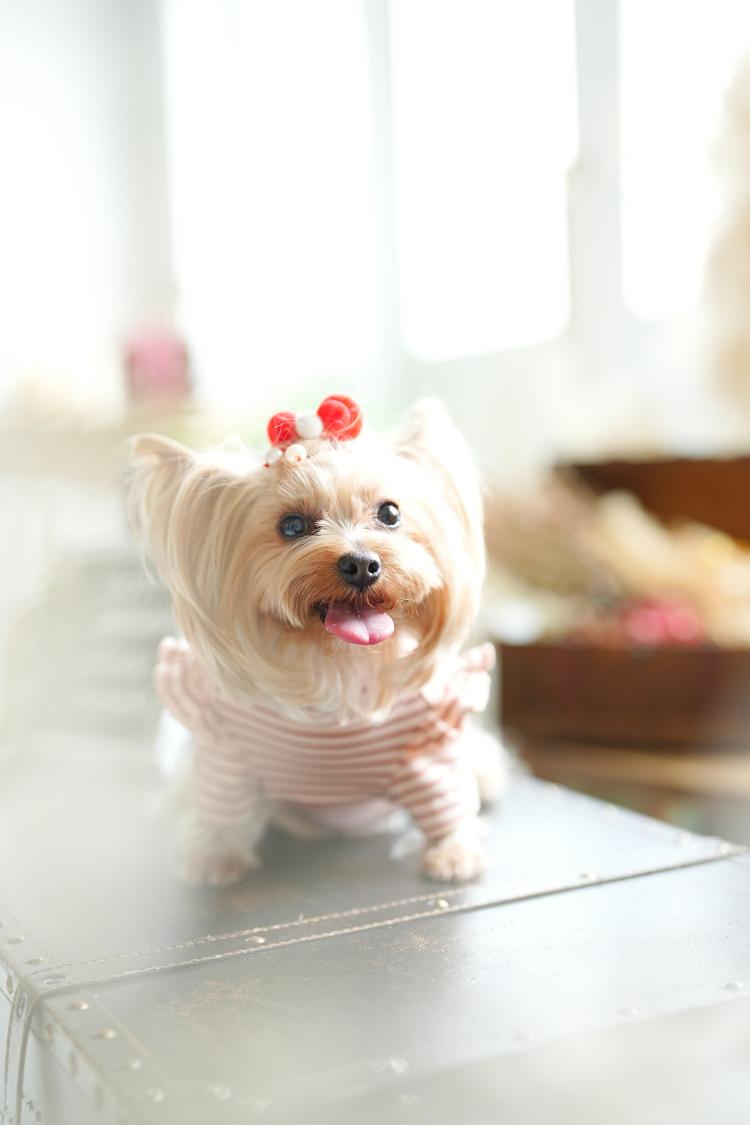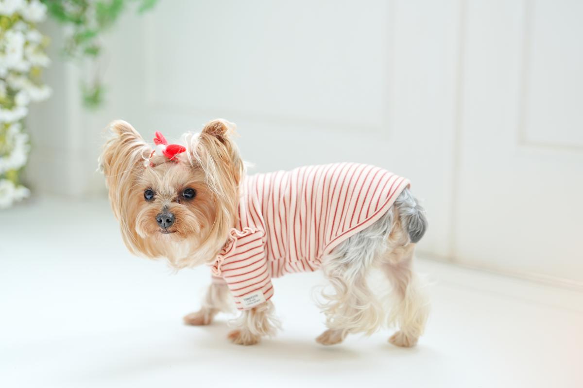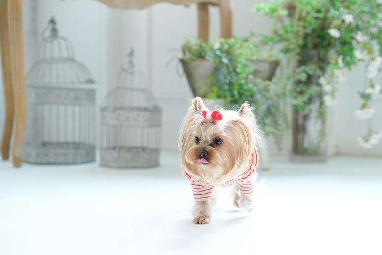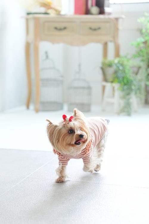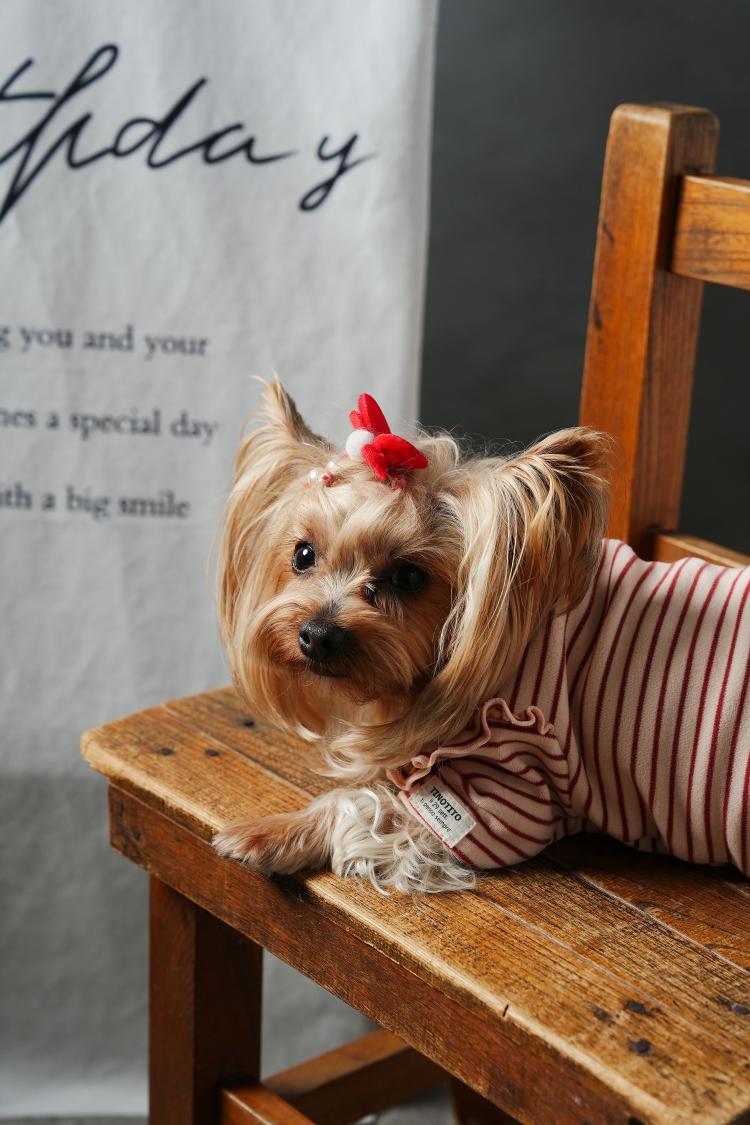 スタジオの扉が開いた瞬間、赤白ボーダーのお洋服とリボンでおしゃれに装った小さなワンちゃんが、飼い主様と一緒に入ってきてくれました。