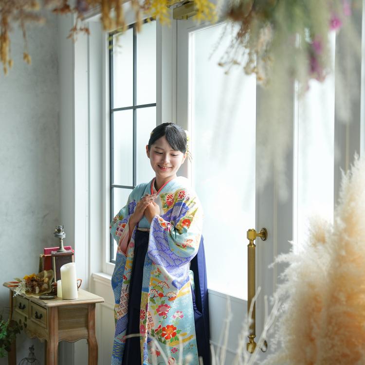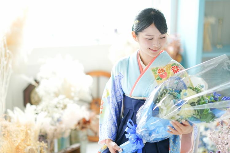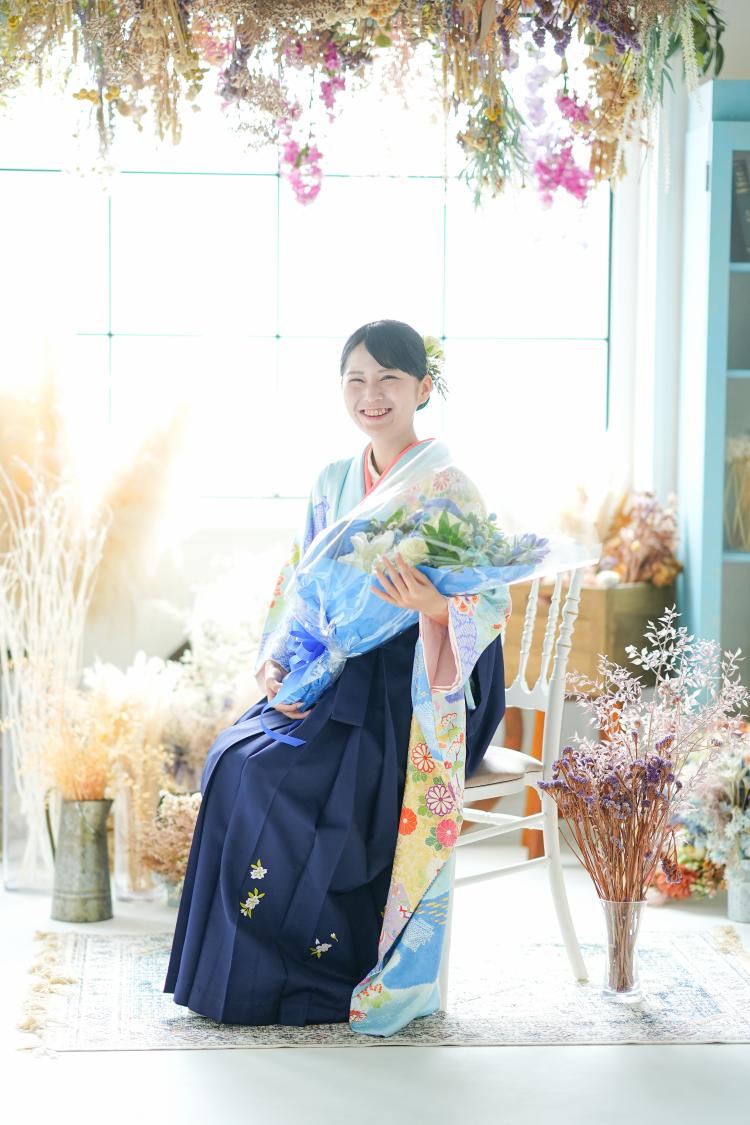 手にした卒業祝いの花束と袴の色合いが揃い、柔らかな光が差し込むスタジオの逆光がその美しさをさらに引き立てます。